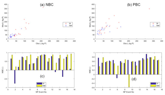A comparison of (1) the observed and simulated TP and TRP loads for NBC (pane (a)) and PBC (pane (b)); (2) the NSE metric for each of the 17 storms analysed (NBC (pane (c)), PBC (pane (d))).
