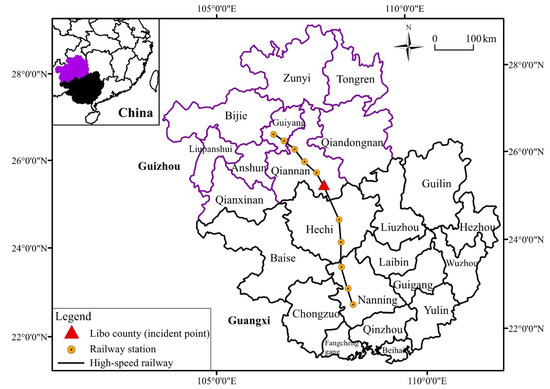 Libo County is located in the southeast of Guizhou Province in China, as shown in Figure 1. The Chaoyang railway tunnel is a part of the Guiyang–Nanning High-speed Railway Project, which represents a key section of the “China’s Midium- and Long-term Railway Network Plan 2016”. With a total investment of 75.8 billion CNY (11.4 billion US $), The Guiyang–Nanning High-Speed Railway Project is designed to achieve a running speed of 350 km/h and transportation capacity of 40 million people per year. There are 11 stations along the line from Longli North Railway Station in Guangxi province to Nanning Dong Railway Station in Guizhou province. The overall length of the project covers 512 km of which 483 km are newly constructed.