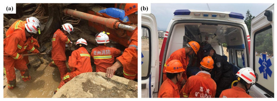 Joint rescue activity: (a) Firefighters searching for victims; (b) emergency treatment (Picture source: http://m.news.cctv.com/2018/06/11/ARTI6F58tT5PonH5KXoex9X5180611.shtml).