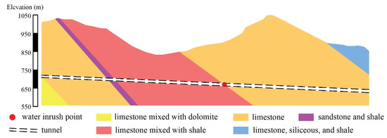 The incident point is covered by the terrain of karst depression with a buried depth of about 230 m. Figure 5 shows the geological map of Libo County. The tunnel passes through a medium-low mountainous area with peak bushes and low-lying valleys. The site is covered by soft layers of silty clay with average depth of 0–2 m, and the bedrock of Permian Qixia Formation limestone, limestone with intercalation of shale, Carboniferous Maping Formation limestone, and limestone interlayered with dolomite. Figure 6 shows the sectional view of geological conditions along the tunnel alignment. The incident occurs when excavation in the contact zone of limestone and limestone interlayered with shale, which is water softened and is easy to disintegrate when exposed to air.