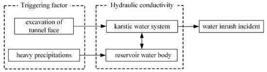 The rainfall water was considered as another significant cause of the water inrush incident. The monthly average rainfall in Libo County reached its peak (244.45 mm) in June, as shown in Figure 7a. The precipitations in May 2016 and 2017 measured 222.3 mm and 184.8 mm, respectively, according to the information provided by the local weather bureau. However, statistical records for the same period but 2018 reveal that the precipitation reached 250.4 mm, which is more than twice as the monthly average rainfall of 103.7 mm. Moreover, Libo County was stricken by a heavy rainfall on 4 June. The precipitation reached the astonishing value of 53.6 mm, as shown in Figure 7b. The intense rainfall is one of the critical triggering factors since it resulted in the increase of surface water which became the main recharge source of underground karst water system. Consequently, the unfavorable situation was further aggravated because of the triggering factor of heavy rainfall and tunnel excavation. Figure 8 shows a schematic cause-and-effect diagram of the water inrush incident.