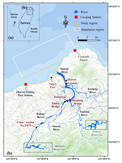 Surrounded by seas on all sides, Taiwan is subjected to 3–4 typhoons on average per year. The Tamsui River is the largest river in northern Taiwan, and variations of erosion and deposition on the river bed are closely related to flows and sediment transport in the adjacent marine waters (Figure 1). In recent years, owing to the construction of the Taipei Port, the littoral drift in the estuary and adjacent coastal areas has been gradually changed, which affects the adjacent coastal terrain and landscape [6]. In addition, serious siltation occurs in the Shihmen Reservoir upstream of the Tamsui River, with the total siltation in the Shihmen Reservoir reaching 1.86 million m3 by the beginning of 2017—a volume accounting for 32.6% of the designed water-storage capacity of the reservoir [7]. To alleviate the reservoir siltation problem, meet the industrial water demand, and extend the reservoir life, the Water Resources Agency of the Ministry of Economic Affairs plans to add a desilting tunnel under the water storage limit of the Shihmen Reservoir at the Amuping and Dawanping areas [8]. The Amuping desilting tunnel is expected to be completed by 2022, and it will lead to changes in the amount of sediment transport in the Tamsui River and indirectly affect the sediment transport equilibrium between the river and the sea.