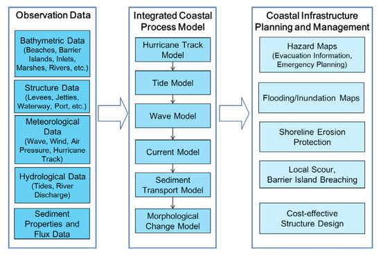 Heavy rainfall, waves, storm surges, and high tides during cyclone (typhoon or hurricane) periods cause hazards, such as flooding/inundation and shoreline erosion in coastal areas. A full understanding of the behavior of water bodies and their movement in estuarine areas during cyclone periods is essential for flood control, disaster mitigation, coastal erosion protection, and coastal structure preservation. Integrated coastal and estuarine process models (ICEPM) can simulate multiple physical processes, such as tides, waves, surges, river flows, wind, sediment transport, and morphological changes, e.g., [1,2,3,4,5]. They are applicable to study hydrodynamic and morphodynamic processes in response to what-if scenarios of coastal protection practices, and, therefore, facilitate safety assessment of estuarine areas and the determination of coastal management measures to prevent or reduce disasters and to stabilize shorelines.