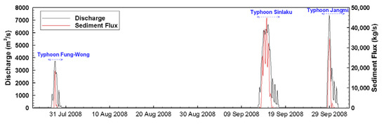 This study used the 2008 events of Typhoon Fung-Wong, Typhoon Sinlaku, and Typhoon Jangmi to carry out the model validation. The starting and ending times of each typhoon event are listed in Table 1. The topo-bathymetric data used in the model were measured using single-beam echosounders in May 2008. The tidal levels at the west and east boundaries were given by measured tidal gauge data at the Linshanbi and Zhuwei Fishing Port stations. The wind data measured at the Taipei Harbor meteorological station were used to generate time-dependent and spatially-uniform wind fields. The peak flows in the three typhoon-induced flood events were 3798, 6476, and 7332 m3/s, respectively, whereas the sediment concentration was controlled by the sediment discharge operation of the stream Shihmen Reservoir, with the maximum concentration of 45,042 kg/s occurring during the period of Typhoon Sinlaku (Figure 4). It was assumed that the flow at the Guandu Bridge was 50 m3/s, and the sediment concentration was 0 kg/s in the absence of flood drainage at the reservoir. The simulation period ranged from 17:00 on 23 July 2008 to 00:00 on 1 October 2008, totaling 1675 hours. The model was spun up by computing the tide flows from 17:00 on 23 July 2008 before introducing Typhoon Fung-Wong, in which the time step was set to 30 s. After the spin-up, the wave–current interaction for modeling morphological changes was conducted for 66 days until the end of Typhoon Jangmi at 00:00 on 1 October 2008. Then, the time step for computing flows was changed to 10 s; the time step for updating bed elevations was 100 s. The wave field was recomputed every one hour based on the latest flow field.