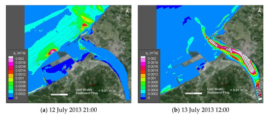 In response to Typhoon Soulik, the Shihmen Reservoir was operated to tentatively discharge the floodwater at 21:00 on 12 July 2013. The flow at the Guandu Bridge was approximately 273 m3/s. At this time, the sediment flux of the estuary was dominated by littoral drift, which moved in the same direction as the longshore currents (Figure 11a). At 12:00 on 13 July 2013, due to the flood control and discharge operation of the Shihmen Reservoir, the flow at the Guandu Bridge reached 5786 m3/s, together with the sediment flux of 33,443 kg/s (Figure 8). At this moment, the estuarine sediment flux was dominated by the river-transported sediment (Figure 11b). The sediment was then transported by the upstream river flood to the estuary, reaching as far as the offshore around the area with the bed elevation of −25 m. The high sediment load was mainly concentrated on the river channel close to the right bank. At this flood peak, the computed unit-width sediment transport flux can reach up to 2.1×10−3 m3/s/m, or 5.57 kg/s/m.