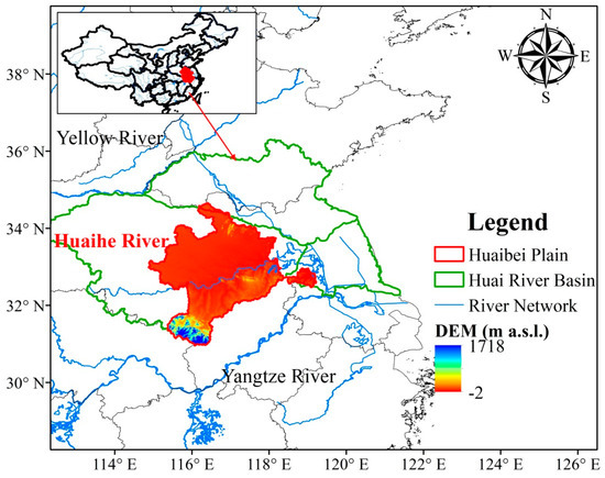 The Huaibei Plain is in the northern part of Anhui Province, China (from 114°58′–118°10′ E to 32°45′–34°35′ N), between the Yellow River and the Huai River, as shown in Figure 1. The Huaibei Plain is an important part of the North China Plain, with a total land area of 37,400 km2. The study area comprises the cities of Suzhou, Huaibei, Bozhou, Fuyang, Bengbu, and Huainan.