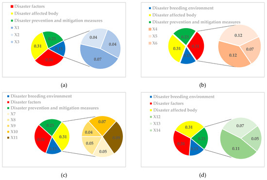 The four subsystems and each indicator in them for the indicator evaluation system of Huaibei Plain in Anhui Province: (a) disaster breeding environment subsystem; (b) disaster factors subsystem; (c) disaster-affected body subsystem; and (d) disaster prevention and mitigation measures subsystem.