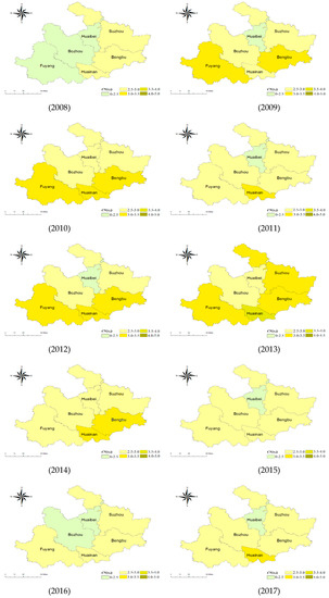 From a temporal perspective, in the period from 2008 to 2017, there were widespread ADD events in the six cities across the Huaibei Plain. The period was roughly divided into three subperiods: (1) From 2008 to 2010. In 2008, the connection numbers of the six cities were relatively small, while, in the following two years, the numbers increased continually and the scope expanded. In 2010, a moderate degree of ADD gradually spread to the whole southern region. (2) From 2011 to 2013. During this stage, ADD was more serious than in the previous period. Although the status in 2011 was somewhat reduced compared to 2010, the occurrence of ADD in the following two years increased rapidly in the southern region. In 2013, Huainan exhibited a severe degree of ADD. (3) From 2014 to 2017. During this stage, the status in the region was alleviated compared to the previous period and the degree of ADD in each city of the Huaibei Plain was mainly mild from 2014 onward.