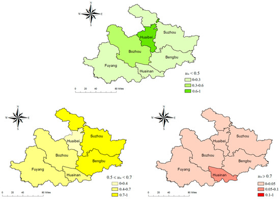 Figure 5a shows that the transcending probability value of si falls in the range of um∈[0,0.5], indicating that the risk of ADD events occurring is not high in each city. Figure 5a shows that most areas except Huaibei are light green, which indicates that the area faces a high risk of ADD. Combined with Table 3, these findings show that the frequency of ADD at um > 0.5 is once every 2.8 years in Huaibei, with the possibility of ADD events every 2–3 years, representing the lowest ADD risk of all of the cities assessed. The average frequency for the southern four cities is once every 1.2 years, which is more frequent than the 2.3 years in Huaibei and Bozhou in the north. In the present study, the southern region was found to be nearly twice as likely to be struck by ADD as the northern region.