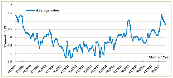 Based on the comprehensive assessment in Section 3.2, due to the influence of natural and social factors, a mild to moderate degree of ADD occurred frequently across the Huaibei Plain from 2008 to 2017, with the status being relatively serious in 2013. Since 2014, the impact of ADD in the various cities has reduced. The SPI is a standardized index comparing precipitation over a period of time with the same period in the location’s history. It is often used to monitor the severity of drought. We calculated the 12-month SPI of each city using the monthly rainfall history data from 1983 to 2017, obtaining the average value in the cities across the Huaibei Plain from 2008 to 2017 (Figure 6). Figure 6 shows that the number of negative SPI values increased from 2009, and only slightly improved until 2015, which shows that the rainfall in the whole Huaibei Plain was less in this period. In particular, from 2011 to 2013, the SPI value fluctuated from −0.5 to −1, indicating that the drought was more serious, which is consistent with the comprehensive evaluation results.