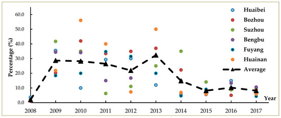 Figure 7 shows that drought-affected areas make up a large part of the cultivated land area, indicating different degrees of ADD occurring in cities across the Huaibei Plain from 2008 to 2017. Combined with the average percentage every year, the results show the relatively largest affected area across the observed period was in 2013, accounting for nearly 35%, while the affected area has decreased since 2014 [24,25]. This finding is consistent with the results of the comprehensive evaluation presented in Section 3.2. According to statistics, there was a rare weather system with high temperatures and low rainfall in southern China in 2013, which lasted for a long duration. The extreme maximum temperature, average temperature, and number of continuous rain-free days on the Huaibei Plain exceeded the averages in previous records for the same period, resulting in the frequent occurrence of ADD in the study area, especially in the summer.