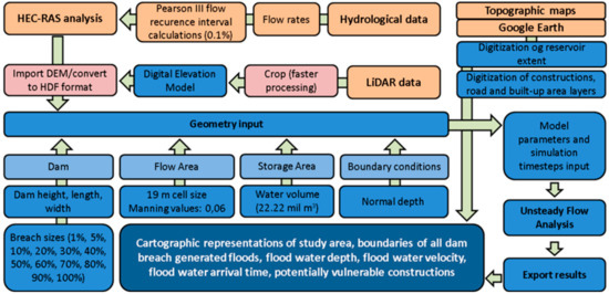 Figure 2 represents the methodological workflow followed in this study, involving the hydrological recordings of flow rates, the LiDAR derived terrain model, topographical maps, Google Earth derived layers, and the steps concerning the 2D HEC-RAS dam breach flood model.