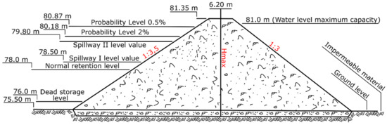Flood occurrence probabilities were taken into consideration, for comparing with the HEC-RAS simulations, and the most representative value chosen was 0.1%, associated with a probable flood, which could take place every 1000 years, in order to estimate which breach size would correspond to this probability. The dam was designed to protect against an upstream flood associated with a 0.5% occurrence probability, provided that the lake level is at the normal retention level. Additionally, the 0.1% probability is the first statistical value to threaten the integrity of the dam, considering that the cross-section sketch of the dam reveals a maximum water level of 5.85 m, corresponding to an elevation of 81 m (Figure 3). Any value beyond that could possibly lead to structural damage.