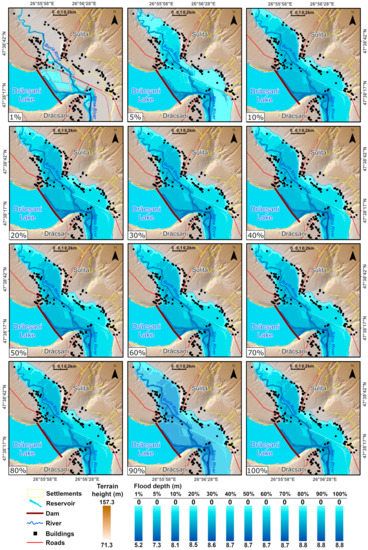The 12 mapped scenarios emphasized the vulnerability of the numerous buildings in Sulița village, in the face of backwater flood water phenomenon, which also emphasized the 10% critical scenario, at which floodplain saturation with floodwater was almost met (Figure 4). Both average and maximum depths were of significant importance, due to the increased potential destructive energy of the flood wave at deeper flood water layers. The maximum depth distribution for the given scenarios confirmed the presence of the critical 10% breach size. Above this threshold, maximum depth values tended to stagnate, at 8.5–8.8 m, which was explained by the large floodplain widths, which could accommodate a very large volume of water.
