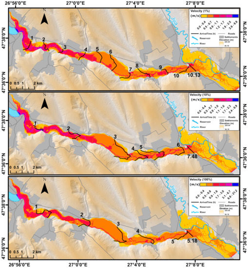 Considering the fairly similar values of the average water velocity for the breaches above and including 20%, the high maximum water velocity values were only valid for isolated situations, mostly associated with the breach location and certain narrow, straight river sections. Otherwise, the average speed was very much attenuated by the large flooded areas (mostly on a lateral orientation). Here, water was almost stagnant, at a significant distance from the flood wave centerline, such as the outer, side regions of the floodplain, where depth values were also reduced. Additionally, the general river course was significantly sinuous, and the floodplain roughness mostly corresponded to arable land (Manning coefficient value of 0.06). Taking into consideration the existence of a critical breach size at 10%, and the lowest and largest parameter values, velocity and time travel were relevant to be mapped at these specific simulations (Figure 5).