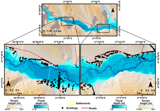 There are differently constructed built-up areas along the river valley, some locations offering better flood protection for the local homes, while others are mostly exposed. Lunca village has numerous buildings distributed on a perpendicular direction to the river’s flow direction, which makes them highly vulnerable in the direct path of the flood wave. On the contrary, Cernești village, for example, is comprised of houses more suitably built, safe from potential floods (Figure 6). This stands as a testimony for the importance of building permit restrictions in flood prone areas, and good land planning management, as well as the need to address the issue of proper hydrotechnical constructions, for flood damage mitigation.