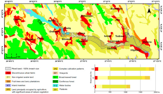 Land along the floodplain is regularly more fertile than surrounding areas, and almost perfectly flat (which aids in the easy deployment and operation of farming machines), and this was also the case here. This explains the dominance of agriculture-related areas, which are potentially subjected to flooding, at various breach size simulations. The most notable issue is that the inhabited areas most exposed to flooding (Lunca village) are located in the upper third of Sitna river valley, which is unfavorable because of the narrow width of the floodplain, and the shorter alert time for evacuation.