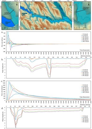 Therefore, adding up all the aforementioned specific findings, the main conclusion is that the breach size did not have to be associated with a highly improbable catastrophic dam failure, of 100%, in order to be considered disastrous, but rather, with a minimum 10% breach size value, which corresponds to a significant flood extent, and low travel times.