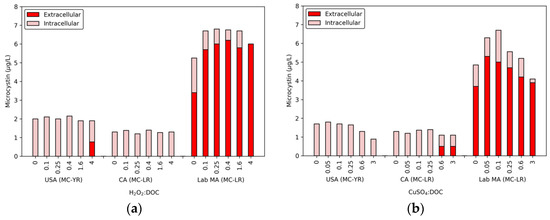 4:DOC) had a measurable decrease in the total MC-YR level (0.4 μg/L), which was attributed to the release of extracellular toxin at a level below the MRL (0.5 μg/L). At 0.6 and 3 CuSO4:DOC, the CA bloom had 0.5 μg/L of extracellular MC-LR. In the lab-cultured MA sample, the 0.05 and 0.1 CuSO