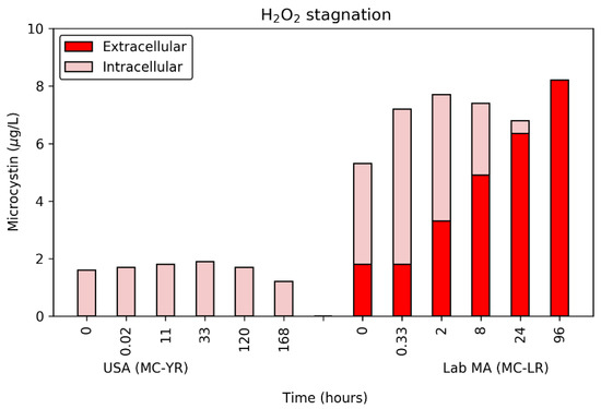 Section 2.5), the impact that stagnation had on the DOC, pigment, and intra- and extracellular MC was evaluated. For the hydrogen peroxide stagnation experiments, amber glass bottles with the cyanobacterial suspensions were exposed to 0.4 H