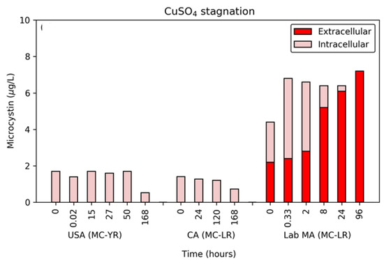 The primary parameter of concern for cyanobacterial blooms is the release of MCs following treatment. Unlike the stagnation period following dosing with hydrogen peroxide, the release of MC-LR from the lab-cultured MA during exposure to copper sulfate occurred after a lag period of approximately 8 h (