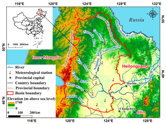 The NJW, covering an area of 297 × 103 km2, is located in the core region of Northeast China (Figure 1), with latitudes from 44°1′48″ N to 51°42′1″ N and longitudes from 119°12′1″ E to 127°54′2″ E [28]. Obvious terrain variances can be found in this area with elevations ranging from 120 to 1740 m above sea level. The highest elevation is in the northwest at the Greater and Lesser Khingan Mountains, and the lowest elevation is in the southeast at the Songnen Plain. This is why the lakes and reservoirs are mainly observed in the southeast. The NJW is dominated by a temperate semi-arid continental climate with an mean annual precipitation of around 470 mm and a mean annual air temperature of 4 °C [29]. Most precipitation (82%) occurs in months from June to September which is a critical growth period for vegetation in this region. As an important grain base in China, the NJW plays an critical role in promoting regional economic development and ensuring national food security [30,31]. Moreover, this region provides important habitats for threatened species and migratory waterfowls.