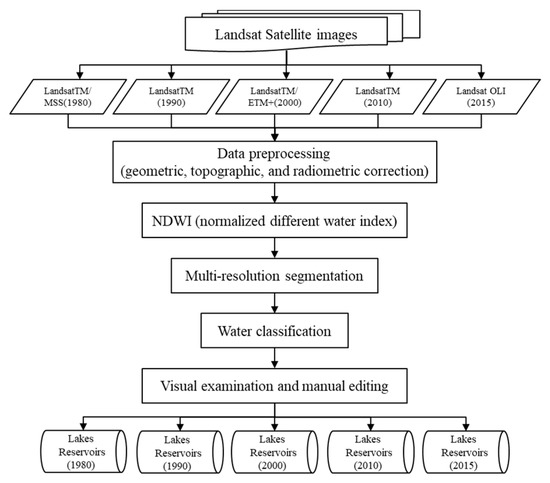 We focused on lakes and reservoirs greater than 1 km2 in terms of the 30 and 80 m resolutions of the satellite images [35]. An object-based image analysis (OBIA) was used rather than the traditional pixel-based classification method, because OBIA classifies objects instead of individual pixels [36,37,38]. In the process of OBIA classification, the spectrum, spatial information, texture, and geometric features characterized by remote sensing images were fully utilized. The lake and reservoir extents of the NJW in 1980, 1990, 1998, 2000, 2010, 2013, and 2015 were extracted in eCognition Developer 8.6 [14,39]. The normalized difference water index (NDWI) is the most popular used index for automated inland waterbodies delineation [35,40,41]. In addition, we tested different versions of NDWI (mNDWI, NDRW, and NDWI) [21,42] and found that the selected NDWI is more effective in our study area. Therefore, NDWI was applied to extract lakes and reservoirs, which was defined as: