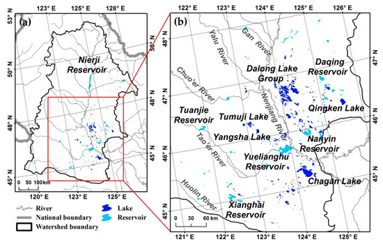 As one of the third-largest waterbody clusters, an eco-environmentally fragile area, and an important base for grain production, the Nenjiang watershed (NJW) plays an important role in ecological conservation and national grain security in China [28]. However, the changes in lakes and reservoirs across the NJW during recent decades have rarely been examined and their correlations with climate change and human disturbances have rarely been quantitatively investigated. Doing so is critical to understanding the regional water cycle and sustainable water resource management. Therefore, this study aims to (1) employ Landsat 8 images to investigate the current status of lakes and reservoirs in the NJW, (2) evaluate changes in area and number of lakes and reservoirs using consistent Landsat images (i.e., 1980, 1990, 2000, 2010, and 2015), and (3) quantify the roles of climatic factors and artificial variables in driving lake changes.