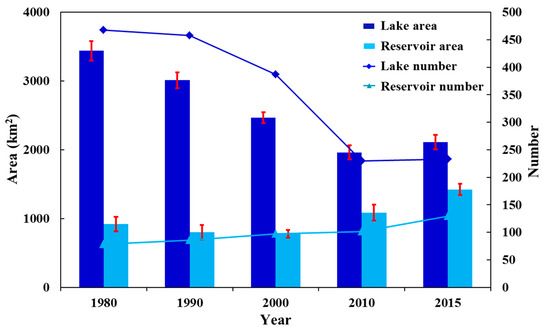 Decadal variations in the total area and number of lakes and reservoirs (area ≥ 1 km2) in the NJW from 1980 to 2015. The error bars represent the 95% confidence level.
