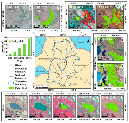 On the other hand, the study area is an important grain production base in China. Agricultural demand for water had potential impacts on lakes. Besides climate change, human activities have imposed marked impacts on lakes and reservoirs [52]. While our study revealed that climatic factors drive striking lake and reservoir changes, human-induced changes should be responded to as quickly as possible. In this study, a clear correlation (β = 0.17, p < 0.1) was observed between lake area and crop area (Figure 8). Lake shrinkage caused by artificial variables is mainly attributed to the agricultural water consumption in the NJW [50,53]. Due to the construction of large reservoirs upstream water was therefore impounded upstream, which seriously affected the water supply of lakes in the middle and lower reaches. In particular, the largest reservoir, Nierji Reservoir, constructed over the upstream area of the Nenjiang River exerted a marked influence on downstream lakes. Due to reclamation from lakes and agricultural development during the past 35 years, some lakes in the size class of 1–10 km2 decreased to small lakes with areas smaller than 1 km2. For example, a large area of shallow waters was reclaimed for planting rice (Figure 11). Since 1990, the area of paddy fields in the NJW has increased significantly by 90.26 km2 from 3.46 to 93.73 km2. The total cropland area increased from 459.42 to 948.18 km2. With the population increase and agricultural land expansion in this region, more and more open water resources have been applied to agricultural irrigation. It is evident that the human impacts on lake and reservoir changes could not be ignored.