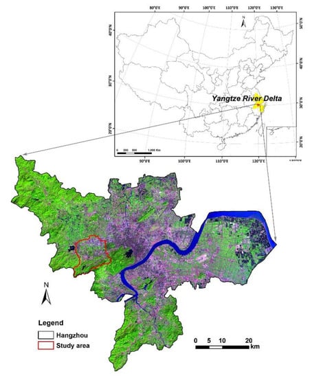 Hangzhou City is a rapidly urbanizing city in the Yangtze River Delta in China (Figure 1). The study area is located in the west of Hangzhou, Zhejiang Province, which is a geographical unit that transitions from the low mountains and hills in the south to the northern plains. There are two large wetlands—the Hemu and Wuchang wetlands, in the study area, with intertwined stream networks. The study area has been experiencing intense urbanization during the past decade, and there have been increased contradictions between urban development and wetland protection in recent years. The study area is in the subtropical humid monsoon climate zone. The mountainous area is mainly composed by bedrock and residual slope deposits, and the plain area is mainly formed by Holocene sediments. The study area is about 120.19 km2, with most of the areas as plain and low-lying lands. The soils have been affected by human activities for centuries and can be categorized as anthrosols (FAO–UNESCO Soil Map of The World, 1988). The background concentrations of the heavy metals Cd, Pb, As, Ni, Cr, Zn and Cu in the plain area of the study area were 0.206, 38.2, 10.0, 41.1, 92.1, 110.0 and 40.8 (unit: mg/kg), respectively []. Except As, the concentrations of the other heavy metals were slightly higher than the corresponding values of the 1st class natural background given in the Soil Environment Quality Standard of China (GB15618-1995).