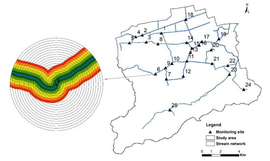 To explore the spatial scale effects of land use on water quality, two kinds of buffer scales were utilized, i.e., the riparian buffer zone along a specific stream and the circular buffer zone around the sampling point. In the literature, the buffer extent (width or radius) generally ranges from 50 to 1000 m, even 2000 m, according to the topography or sampling density in a case-specific manner, and the intervals between neighboring buffer zones are usually 50 to 100 m [,,]. In this study, a series of buffers with varying widths/radiuses were tested to screen the optimal buffering schema. For the circular buffer scale, 20 buffering zones with radiuses ranging from 50 to 1000 m and an interval of 50 m were created around each sampling point. For the riparian buffer scale, six total buffering zones with widths ranging from 50 to 300 m with an interval of 50 m were created for each specific stream with a sampling point (Figure 3).