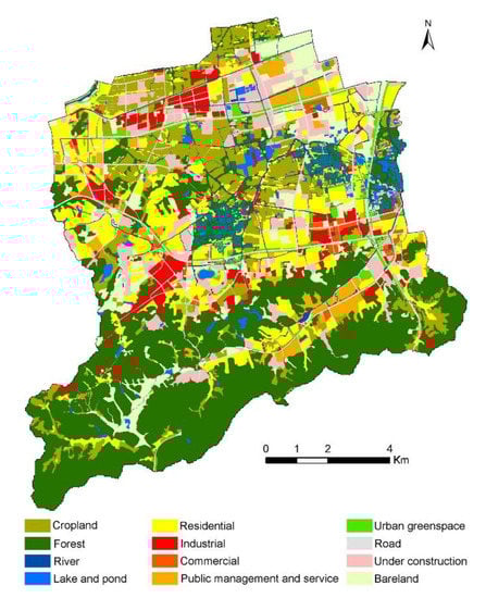 As shown in the land use map of the study area (Figure 4), the forest land is concentrated in the southern mountain area; the lake and pond scattered in the central part of the study area (mainly concentrated in the Hemu and Wuchang wetlands) featured by a dense stream network, ponds and broken forest plots; the cropland concentrated in the north-central area; the industrial land mainly distributed in the north, west and south areas in a state of agglomeration and the large chunks of residential land mainly scattered along the major traffic roads at the eastern and southern areas, as well as the western area.