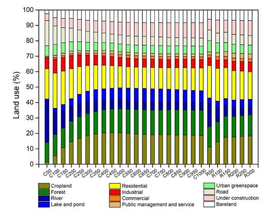 Proportions of each land use at different buffer scales. The labels at the x-axis indicate different buffer zones for the circular and riparian buffer scales, respectively. The initial character “C” or “R” represents the circular or riparian buffer types, and the numerical values after that character means the corresponding buffer radius. For example, “C50” means a circular buffer with a radius of 50 m around a sampling point. Hereinafter, the same.