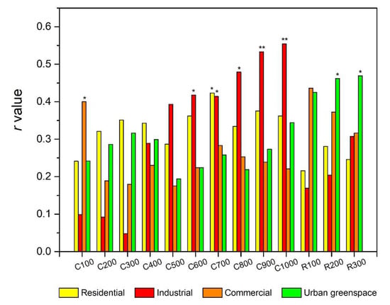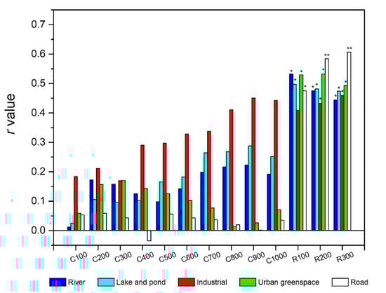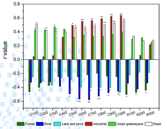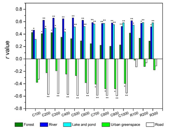 Generally, the construction land is the main source of heavy metal pollution, while the forest and wetland could absorb and promote the transformation of heavy metals [,]. In this study, we found significant positive correlations between heavy metals (e.g., Ni) and the areas of industrial, road and urban greenspace land uses, including significant negative correlations with the forest area at certain buffer scales. Similar to the cases of the TN and TP, there were also uncertainties in correlations between heavy metals and the cropland area, and both positive and negative correlations could be found (e.g., As and Mn). It was noted that there were relationships hard to interpret between certain heavy metals and some specific land uses (e.g., wetland and residential land uses); we suggested that this might be connected with the regional background sources [,].