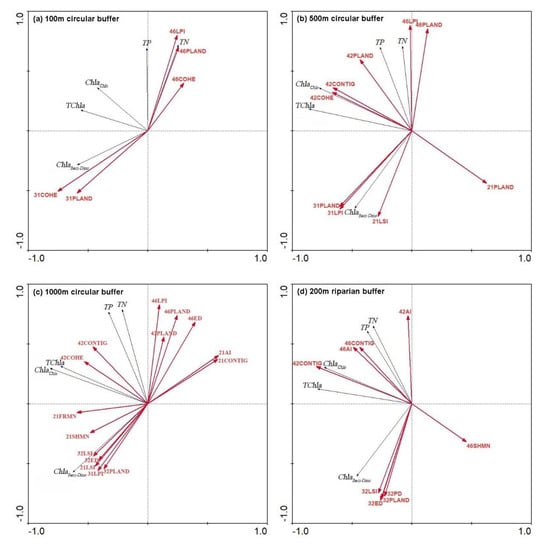 Biplots of water quality parameters (represented by dark blue lines) and landscape metrics (represented by red lines) within the circular buffers of 100 m (a), 500 m (b) and 1000 m (c) and the riparian buffer of 200m (d) according to the redundancy analysis (RDA). The length of the arrow represents the standard deviation of variables in the sorting space, and the direction indicates the change of gradient direction. The cosine values of the arrow and axis represent the correlation.