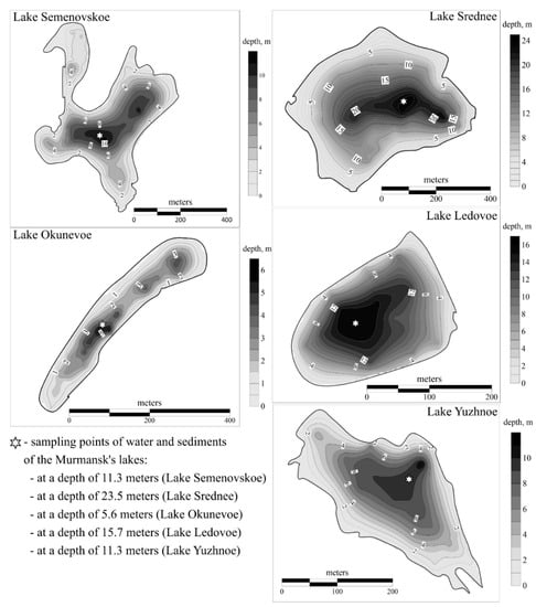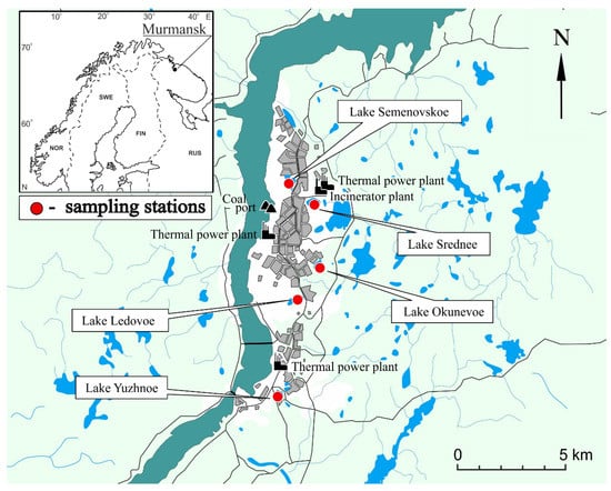 Murmansk is located on the eastern rocky shore of Kola Bay in the Barents Sea and is one of Russia’s biggest ports. Murmansk has around 20 lakes affected by various human activities. In order to fully assess the impact of the urban environment on lake ecosystems, five lakes were selected for the study (Semenovskoe, Srednee, Okunevoe, Ledovoe, and Yuzhnoe) located in different parts of the city of Murmansk and having great recreational significance for the city’s residents and visitors.