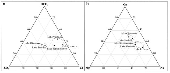 Over Murmansk’s more than a century-long history, the water chemistry in the city’s lakes has undergone significant changes. The pH value of the lake water in 2018–2019 ranged from 6.6 to 9.34. One of the highest values (almost at the border between the alkaline and strongly alkaline values) was recorded in Lake Ledovoe, which receives water from the Varnichny Stream, running through the densely populated city core. The lake is located alongside the city’s main street—Kola Avenue (Figure 1). High water pH values also were recorded in Lake Yuzhnoe—ranging from 8.02 to 9.11 with an average of 8.42, which is considered alkaline and slightly alkaline. The water of the other lakes had neutral pH values (Table 2). Lake Ledovoe had both the highest pH and the highest TDS value—up to 735 mg/L. Lake Yuzhnoe came second in terms of both pH and TDS values, with TDS ranging from 140 to 371 mg/L with an average of 294 mg/L. TDS values in these lakes were dozens of times higher than the values (20 mg/L on average, which can be considered the background level) recorded in the lakes of the northeastern Murmansk region in the Barents Sea water catchment [21,22]. The lowest TDS values were recorded in Lake Okunevoe and Lake Semenovskoe (63 and 73 mg/L on average, respectively), but these were also above the background level. According to the classification [20], all natural waters by chemical composition are divided in concordance with the prevailing anion (equivalents) into three classes: hydrocarbonate (and carbonate) (HCO3− + CO32−), sulfate (SO42−), and chloride (Cl−). Each class according to the prevailing cation is divided into three groups: calcium (Ca2+), magnesium (Mg2+), and sodium (Na+). According to the classification proposed in [23], the lake water in the city of Murmansk is mainly chloride and sodium. The exceptions are Lake Okunevoe and Lake Srednee, where the lake water is typical for most lakes in the Murmansk region, which have a distribution pattern of the main ions in the calcium group and hydrocarbon class (Table 2). A ternary diagram is constructed for the basic cations and anions, which shows the two groups of lakes by the predominant ions—chloride–sodium and hydrocarbonate–calcium (Figure 3). The studied lakes have supply characteristics in different seasons of the year. In winter, when the lakes are covered with ice, groundwater is the main source of water supply, and in summer, atmospheric waters are the main source. Therefore, the mineralization of water in lakes in winter is more than in summer. In this article, the seasonal features of the chemical composition of the water of the lakes are not considered in detail; another article will be devoted to this.
