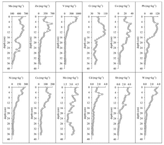 where C is the metal concentration in a given layer and B is the background metal concentration measured in the deepest layer of each sediment core [16]. According to the total pollution index Igeo, there are six pollution levels: uncontaminated (Igeo ≤ 0), uncontaminated to moderately contaminated (0 < Igeo ≤ 1), moderately contaminated (1 < Igeo ≤ 2), moderately to heavily contaminated (2 < Igeo ≤ 3), heavily contaminated (3 < Igeo ≤ 4), heavily to extremely contaminated (4 < Igeo ≤ 5), and extremely contaminated (Igeo > 5).