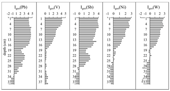 Values of the geoaccumulation index (Igeo) for Pb, V, Sb, Ni, and W in Lake Semenovskoe sediments.