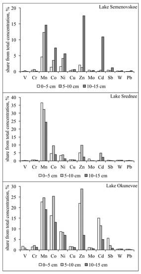 Data on the content of the mobile forms of heavy metals (the sum of water soluble and exchange fractions) in the sediments of the urban lakes in Murmansk demonstrate that the most mobile and bioavailable elements in the lakes are Mn, Co, Zn, and Cd (up to 40% of the total content). However, while in Lake Okunevoe and Lake Srednee there is a gradual increase in content of mobile Co and Zn forms in the more recent sediment, the concentration of mobile forms in the top layers of the core samples (0–5 cm and 5–10 cm) from Lake Semenovskoe decreases significantly to 2–3% (Figure 7). On the other hand, in the sediment from Lake Semenovskoe, the mobility of Cd increases with depth. In Lake Okunevoe there is also a noticeable increase in content of mobile forms of Cd and Ni in the more recent layers of sediment.