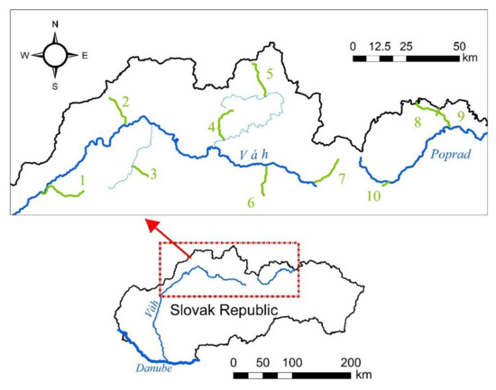 Influence of riverbed morphology on the quality of aquatic habitat, as well as analysis of quality evaluation according to various methods, was carried out on the following streams: Teplička (1), Lesnianka (2), Petrovička (3), Zázrivka (4), Veselianka (5), Kľačianka (6), Hybica (7), Lipnik (8), Kamienka (9), and Teplica (10). The location of selected streams is shown in Figure 1. The results of the ichthyological survey are stated in [15].
