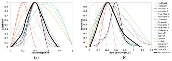 Suitability curves for (a) water depth and (b) flow velocity on the mountain streams of Slovakia. Natural streams (N) are represented by solid lines, and regulated streams (R) are indicated by dashed lines. The average suitability curve is shown by a thick, black line—adapted from [15].