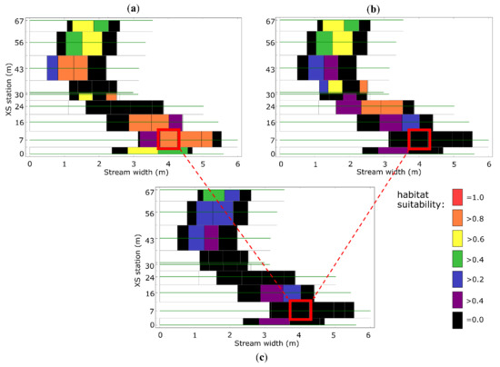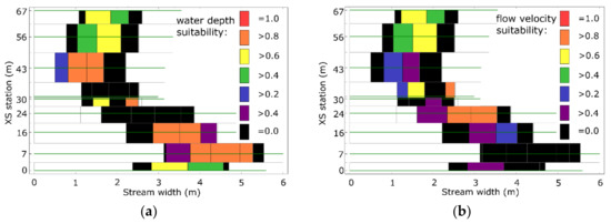 Table 1 shows the output of the RHABSIM model to which the WUA values have been supplemented according to different methods. For the second method, the weight ratio for the parameters Vv:Vd was 2:8. The cross-sections, where the suitability for depth or velocity exceeded 0.4, are indicated by Table 1. The values of the velocity parameters in cross-sections 4 and 6 indicate more suitable velocities and unsuitable water depths. The comparison of Table 1 with Figure 6 clearly shows the areas of microhabitats with a suitability greater than 0.4 (>0.4 = green, >0.6 = yellow, >0.8 = orange, and 1 = red). For example, in cross-section 2, three areas with a suitability of 0.9 are shown in orange (Figure 6b).
