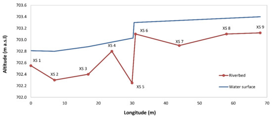Longitudinal profile of the Teplica River. XS is the abbreviation for cross-section.