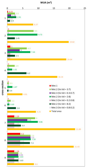 Comparison of the WUA by three methods in individual cross-sections of the Teplica River (values in the histogram are given for Methods 1, 2, and 3; the total area is shown for comparison). Met.: method.