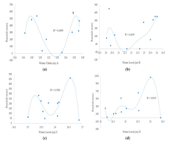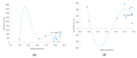 Model summary of polynomial equation analysis for the dependent variable (water level, m) against the independent variable (rainfall, mm) at: (a) water dam A; (b) water dam B; (c) water dam C; (d) water dam D; (e) water dam E; and (f) water dam E.