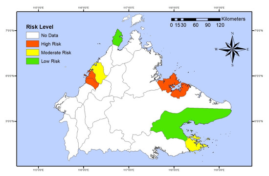The effects of drought can be deleterious. Marcos-Garcia et al. [37] stated that drought is a major natural hazard that can be costlier than any other natural hazard. Smith and Katz [38] mentioned that the global economic losses caused by droughts are significantly higher than that of any other natural disasters, estimated at a cost of around $6–8 billion USD every year. At the national level, droughts can devastate agriculture, ecology, and the economy. On a regional scale, drought can lead to greater instances of fires and significantly deplete water supply reservoirs and groundwater levels, leading to a variety of socioeconomic and environmental impacts [39]. Even though Southeast Asian nations—especially Sabah in Northern Borneo, Malaysia—are countries that are abundant in water resources, they are nevertheless facing a looming water crisis due to increasing demand, unmatched water supply, lack of effective river basin and water resource management, and a growing population [40]. With the expectation that drought events will happen with increased frequency and intensity in the future due to the exacerbating effects of climate change [41], Malaysia is currently ill-equipped and ill-prepared to face the effects [42,43]. In light of this issue, there is a pressing need to assess the degree of vulnerability towards drought to prepare strategies for drought mitigation.