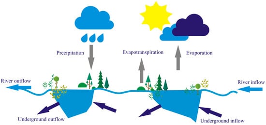 Water exchange in the lakes takes place in their different parts, which depends on the shape and depth of their bowl [32]. According to Kuriata-Potasznik and Szymczyk [29], water exchange is different in the parts of the water body which are partially separated from the main current, whose waters do not have a direct outflow. Properties of the water body parts separated from the main current are similar to drainless lakes, mid-forest reservoirs or those located in a depression, where water exchange is much slower and vertical exchange through atmospheric precipitation and water evaporation from the open water table or from rushes may be more important (Figure 1) [29].