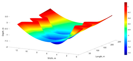 A synthetic river channel bathymetry was developed, based on the synthetic river valley (SRV) methodology [44,45] (Figure 1). The method used mathematical functions to generate realistic geometry of longitudinal and transversal synthetic river profiles [45]. Application of this method created a channel with a pool-riffle configuration based on average bankfull width (), average particle diameter (), average riverbed slope (), critical Shields parameter (), and specific weight of water and solid particles ( and ). SRV bathymetries were defined to represent the average river conditions observed during the field tracer experiments (Section 2.4), with an average bankfull width of 10 m, particle diameter of 0.003 m, and riverbed gradient of 0.002 .